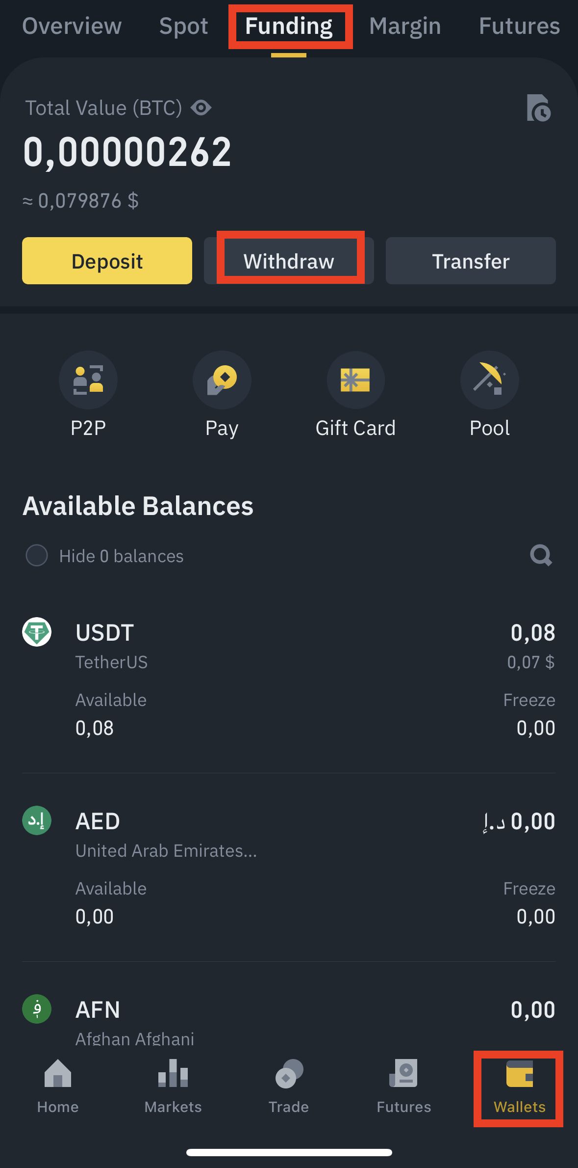 Open the Binance app, go to the Wallet section, then select Deposits and click on the button Withdraw