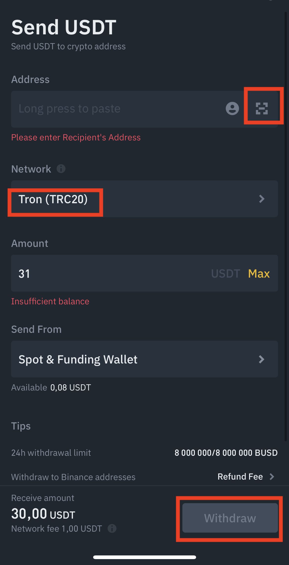 Scan the QR code for payment on the website or copy the address and paste it manually. Choose the network - Tron (TRC20) and click on the button Withdraw funds